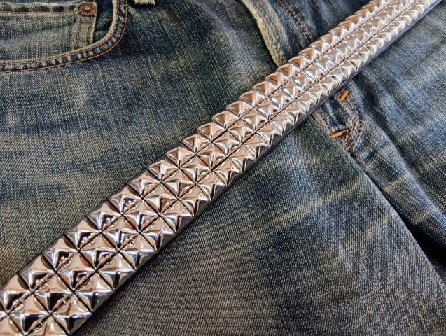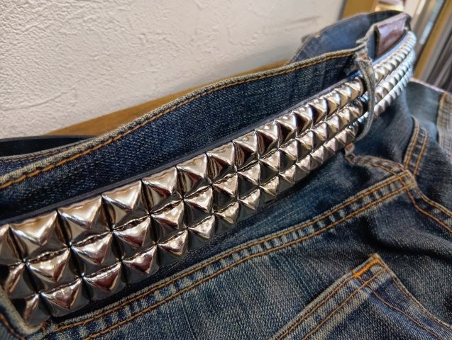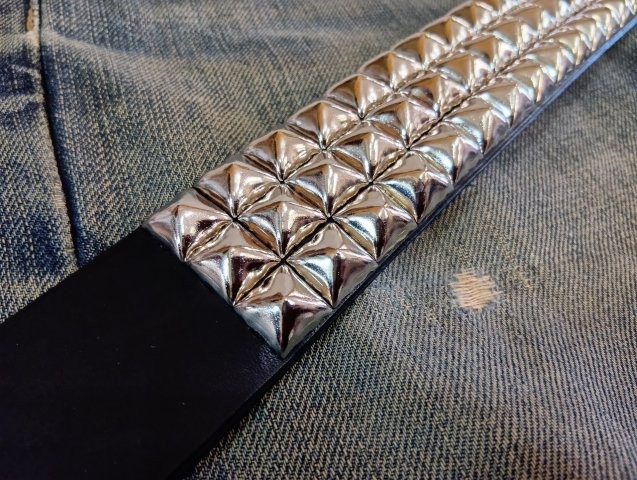 良質の栃木レザーに大きめのピラミッドスタッズを3連に打ち込んだ贅沢なスタッズベルト。通常のピラミッドスタッズよりも一回り大きな12.5mmサイズを使用。40mmのベルト幅いっぱいに打ち込まれたスタッズベルトは、装着するとズシッと重みを感じます。受注制作のフルオーダー商品です。